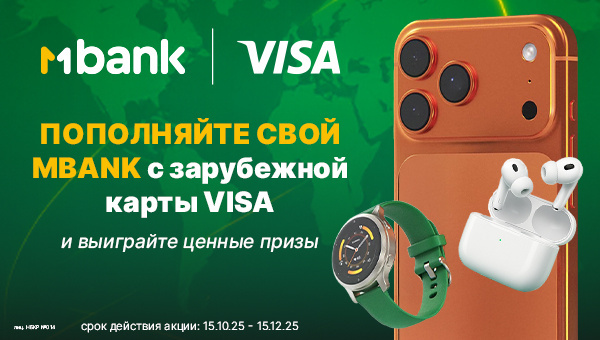 С 15 октября по 15 декабря 2025 года MBANK совместно с Visa проводит акцию "Пополняйте карту Visa MBANK с зарубежной карты Visa и выигрывайте ценные призы".
