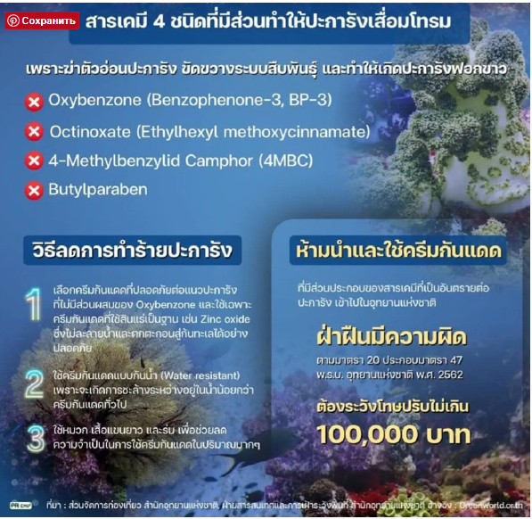 За использование кремов с такими компонентами предусмотрен штраф в размере до 100 тысяч батов (около 267 тысяч сомов). Чтобы любители подводных красот особо не выискивали на этикетках запрещенные вещества, им предложили брать с собой экологически чистые средства, например, с маркировкой Reef Safe и Reef Friendly.