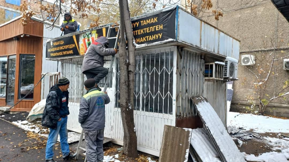 Также в Свердловском районе совместно с управлением по контролю за землепользованием мэрии Бишкека проводится демонтаж объектов облегченного типа, размещенных по ул. Гоголя, вблизи жилых домов №12 и 20.
