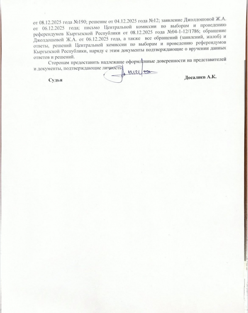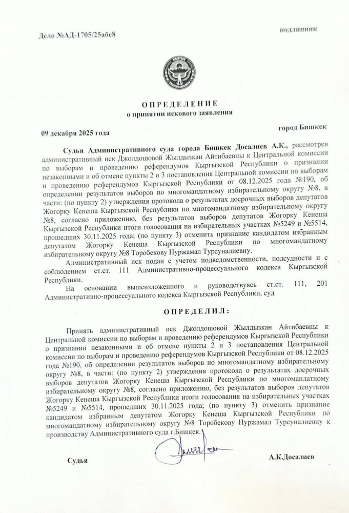Сегодня, 10 декабря, кандидат в депутаты Жогорку Кенеша по избирательному округу №8 Жылдызкан Джолдошова обратилась с иском в Административный суд Бишкека об отмене постановления Центризбиркома №190 от 8 декабря 2025 года об определении итогов выборов в округе №8, которым были аннулированы итоги голосования на избирательных участках №5514, 5249, меняющие итоговый расклад выборов.