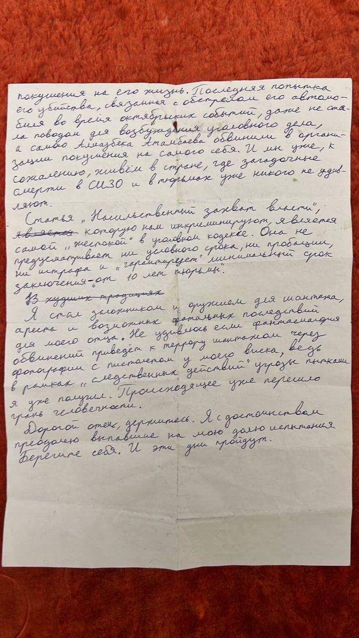 Я прекрасно осознаю суть происходящего. За всю политическую карьеру мой отец пережил пять попыток покушения на его жизнь. Последняя попытка его убийства, связанная с обстрелом его автомобиля во время октябрьских событий, даже не стала поводом для возбуждения уголовного дела, а самого Алмазбека Атамбаева обвинили в организации покушения на самого себя. И мы уже, к сожалению, живем в стране, где загадочные смерти в СИЗО и тюрьмах уже никого не удивляют.