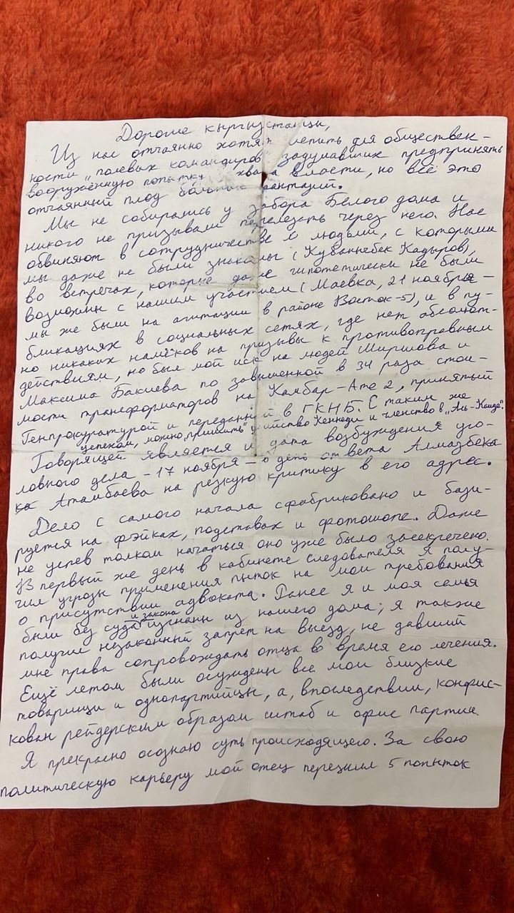 "Мы не собирались у забора "Белого дома" и никого не призывали перелезть через него. Нас обвиняют в сотрудничестве с людьми, с которыми мы даже не были знакомы (Кубанычбек Кадыров), во встречах, которые даже гипотетически не были возможны с нашим участием (Маевка, 21 ноября - мы же были на агитации в районе "Восток-5"), и в публикациях в соцсетях, где нет никаких намеков на призывы к противоправным действиям, но был мой иск на людей Ширшова и Максима Бакиева по завышенной в 34 раза стоимости трансформаторов на Камбар-Ате-2, принятый Генпрокуратурой и переданный в ГКНБ. С таким же успехом можно пришить убийство Кеннеди и членство в Аль-Каиде", - подчеркнул Кадырбек Атамбаев.