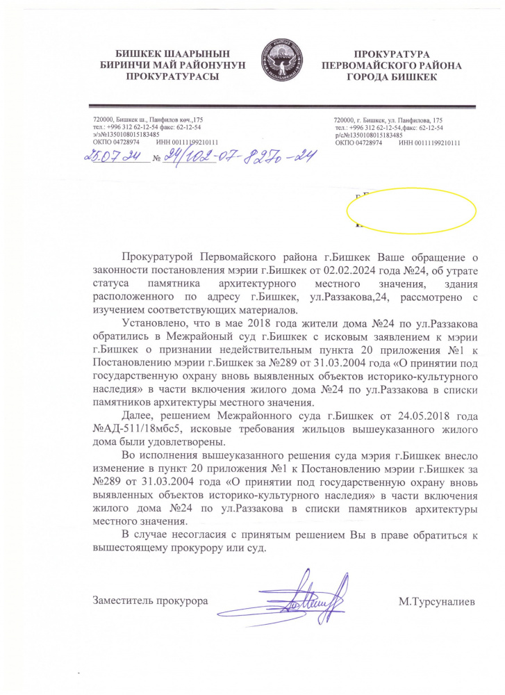 "Что касается здания на ул. Раззакова, 24, там история мутная, но сносят, к сожалению, "по закону", так как жители дома сами обратились в мэрию, чтобы их дом признали аварийным и вывели из списка памятников", - рассказал он.