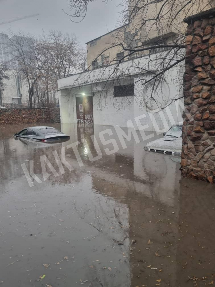 Сегодня, 13 февраля, выпали сильные осадки, о которых ранее предупреждало МЧС. Но осадков оказалось настолько много, что парковка возле Дворца бракосочетания в центре Бишкека оказалась затоплена.