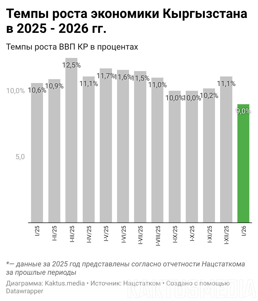 Отметим, по итогам 2025 года ВВП Кыргызстана составил более 1,9 трлн сомов и увеличился на 11,1% (предварительно, по сравнению с январем - декабрем 2024-го).