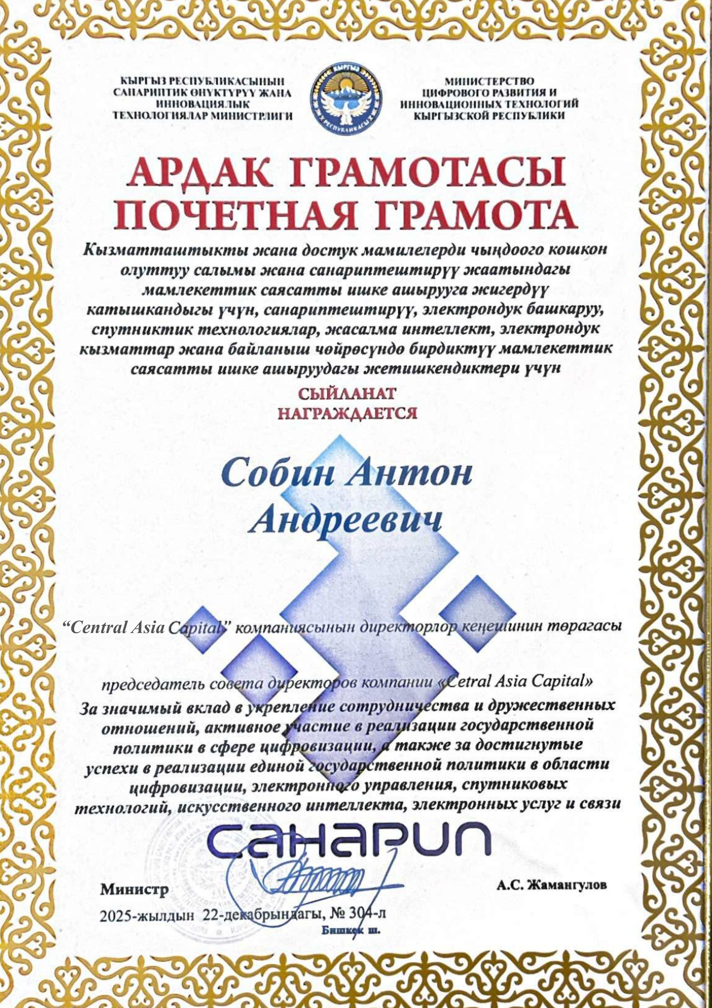 26 февраля министр цифрового развития КР Азамат Саадатбекович Жамангулов вручил грамоту за вклад в цифровизацию фонду Central Asia Capital и его председателю совета директоров Антону Андреевичу Собину. Рассказываем подробности награждения.