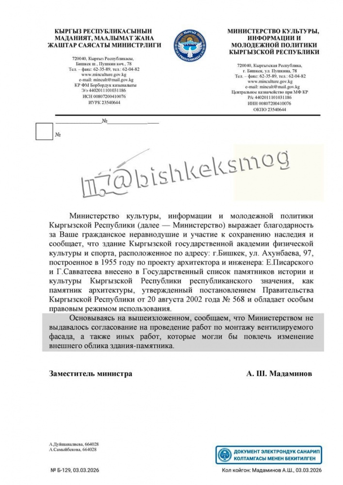 После жалоб горожан, которые заметили стройку и обратились в Министерство культуры, в ведомстве официально сообщили, что не выдавали разрешение на монтаж вентиляционного фасада на здании Кыргызской государственной академии физической культуры и спорта в Бишкеке.