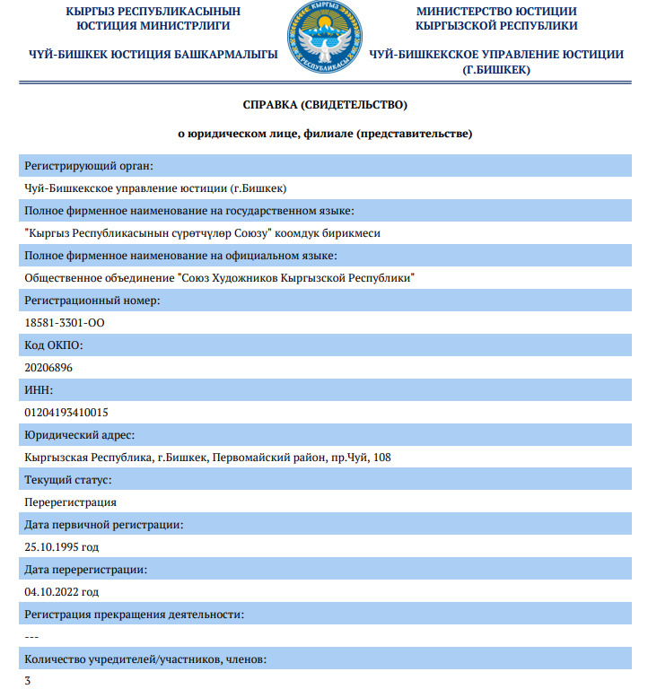 Председатель Союза подчеркнул, что у организации имеются правоустанавливающие документы, включая решения архитектурных органов и положения устава, согласно которым имущественные вопросы должен решать съезд членов объединения. Кроме того, он отметил, что имущество было передано художникам Кыргызстана в пользование еще в 90-е годы.