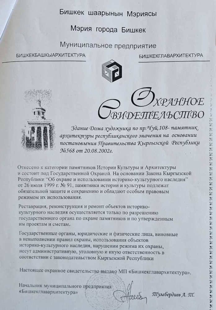 Художники узнали о том, что договор о праве пользования земельным участком аннулируют, и у них больше не будет Дома художника по пр. Чуй, 108, из социальных сетей. Об этом Kaktus.media рассказал председатель Союза художников КР Жакшыбек Джунушев.