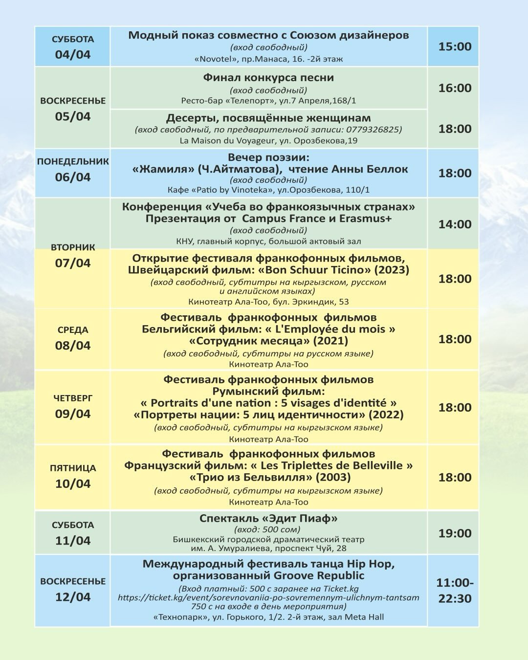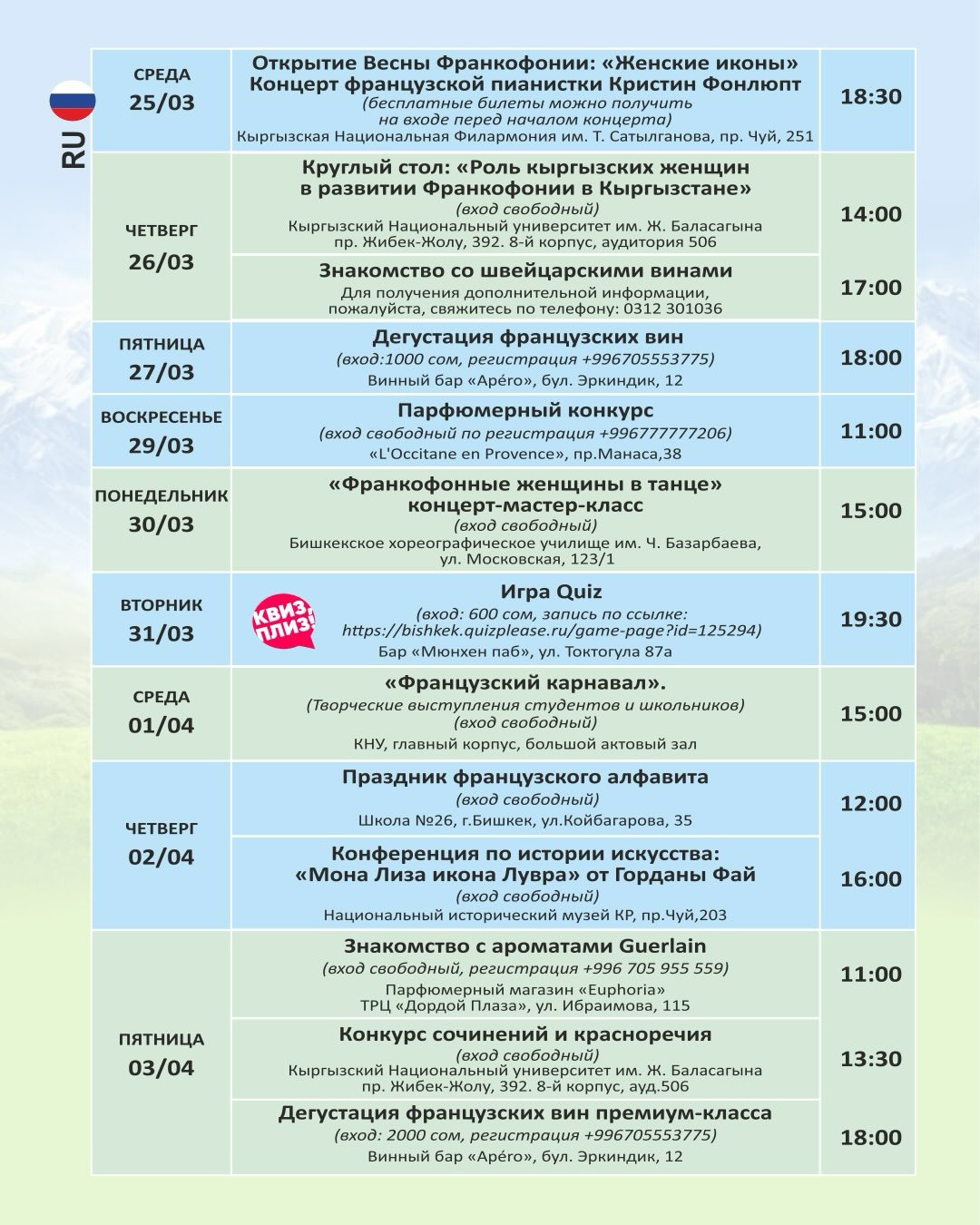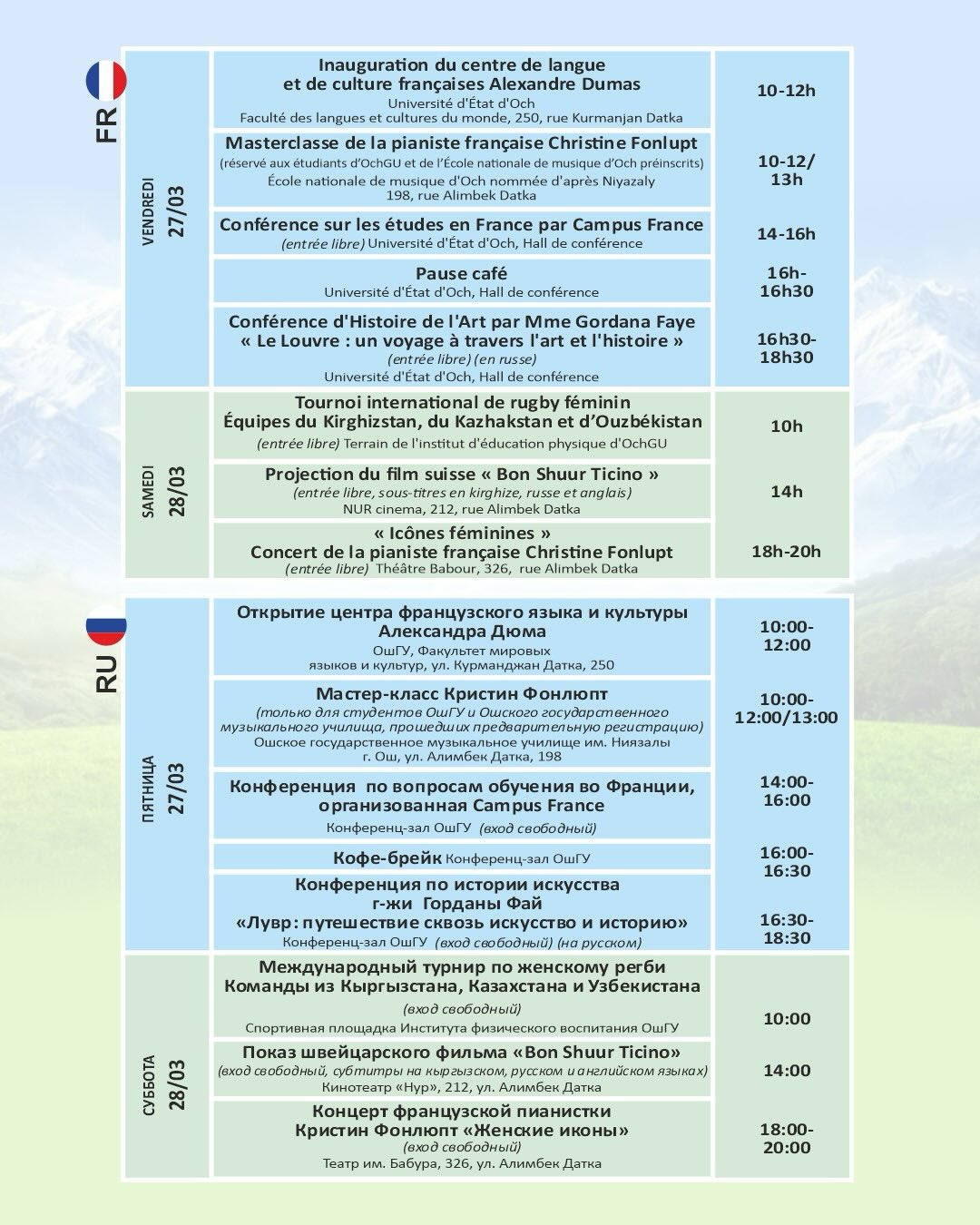 27 и 28 марта в Оше также будут организованы мероприятия "Весны франкофонии": концерт французской пианистки Кристины Фонлюпт, показ швейцарского фильма "Бон шуур Тичино", конференции и другие события.
