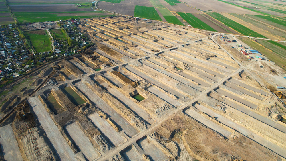 Сейчас котлованы засыпают и поэтапно утрамбовывают специальным материалом, чтобы подготовить основание под будущие дома.