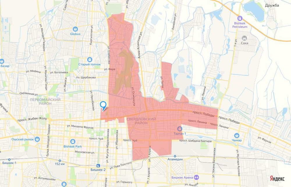 Под отключение попадет район, ограниченный улицей Лермонтова, линией железной дороги, рекой Аламедин, проспектом Чуй, проспектом Жибек Жолу, переулком Никитина, улицами Абдрахманова и Тыныстанова, районом кожзавода, Большим Чуйским каналом, жилмассивом "Бакай-Ата", селом Лебединовка и улицей Калинина.