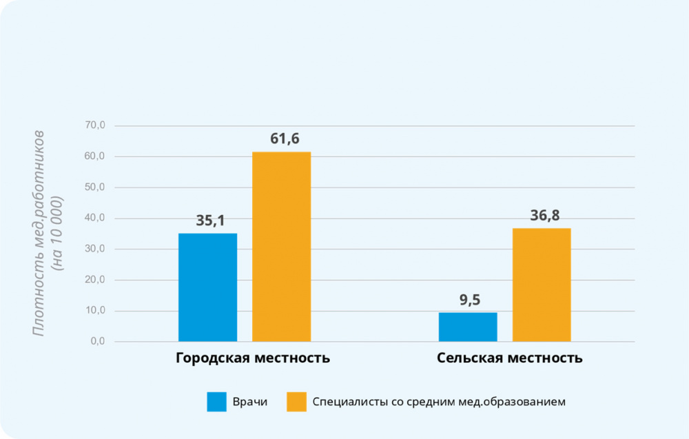 Отмечена и более высокая плотность медицинских работников в городской местности по сравнению с сельской. Так, в городах в четыре раза больше число врачей, в два раза больше число медсестер, акушерок и других специалистов со средним медицинским образованием.