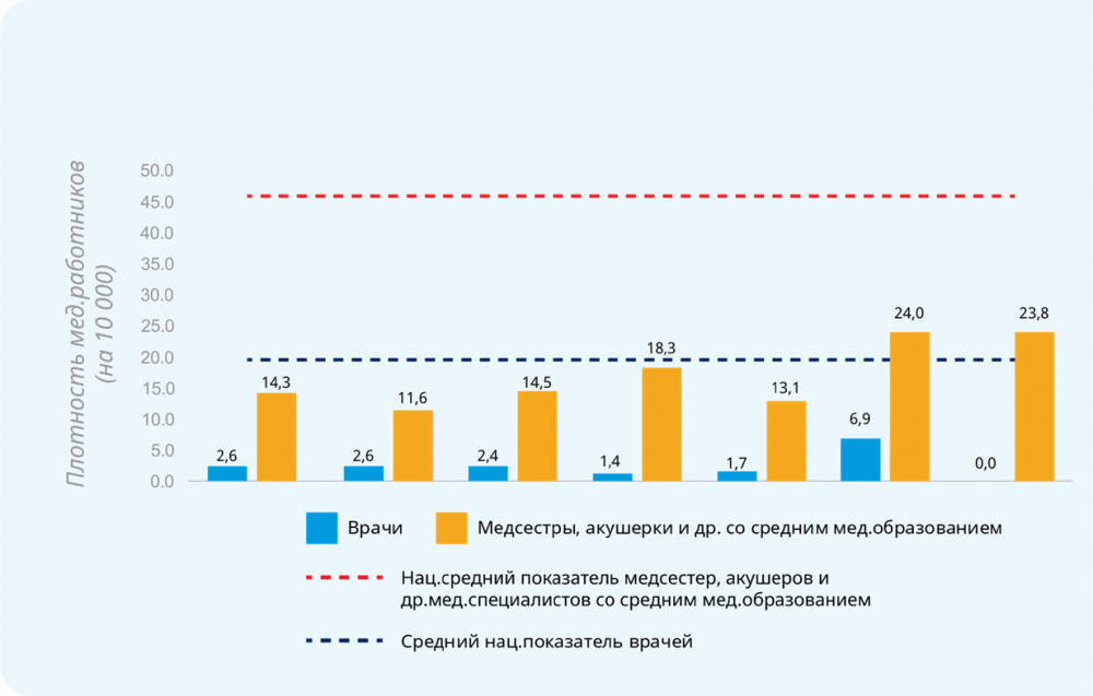 В анализе указано, что в отдаленных и труднодоступных населенных пунктах число врачей составляет только 13,5% от среднего показателя по стране. Число медсестер, акушерок и других специалистов со средним медицинским образованием составляет примерно половину от среднего показателя по стране (на уровне сельских районов в целом).