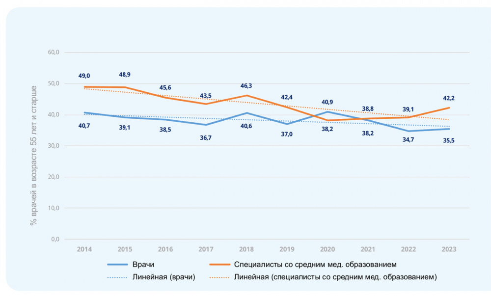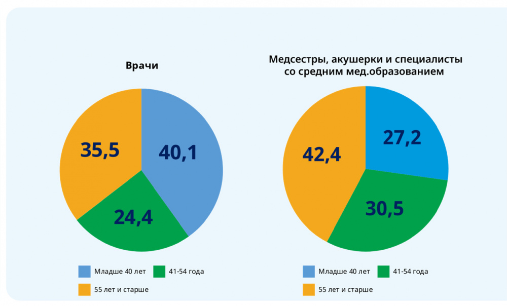 Указано, что доля медицинских работников в возрасте 55 лет и старше растет: 35% врачей старше 55 лет, 42% медсестер, акушерок и других специалистов со средним образованием - старше 55 лет.