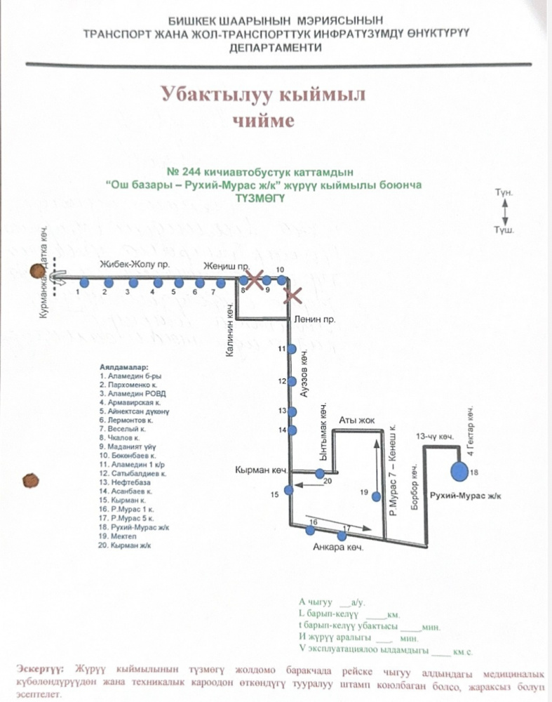 Согласно внесенным изменениям, маршрут №244 теперь обслуживает пассажиров от жилмассива "Рухий-Мурас" до пересечения улицы Курманжан Датки с проспектом Жибек Жолу.